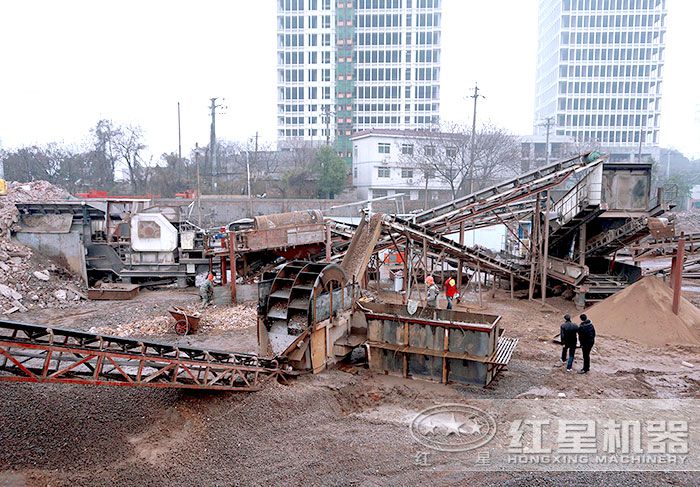 多臺輪胎移動破碎機粉碎水泥塊—紅星機器客戶現場